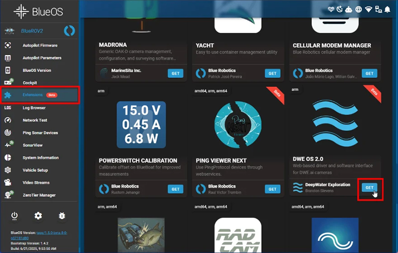 - 「拡張機能」メニューからDeepWaterExplorationのDWE OS 拡張機能をインストールします。