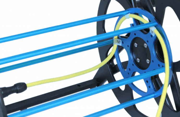 片方の手でテザーリールの回し、もう一方の手でテザーを張った状態に保ち、均等に送ります。