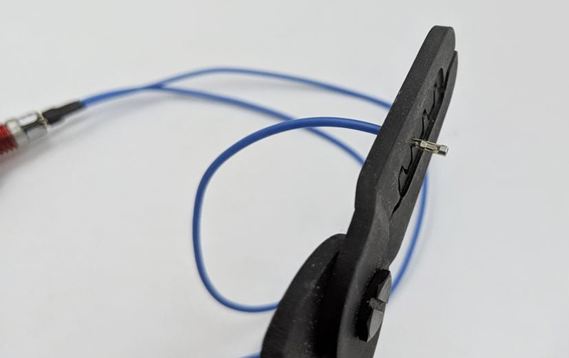 ワイヤ端子用の圧着工具を使用し、被覆を剥いた各ワイヤー端にメス圧着ピンを取り付けます。